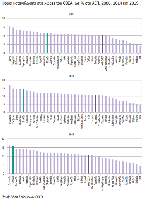 Η αύξηση του φορολογικού βάρους στην Ελλάδα, κατά τη δεκαετία της οικονομικής κρίσης (2009-2019) και των τριών μνημονίων, δεν συγκρίνεται με καμιά άλλη χώρα του αναπτυγμένου κόσμου. Η αύξηση αυτή, της τάξης των 8,5 ποσοστιαίων μονάδων του ΑΕΠ, είναι με διαφορά η μεγαλύτερη ανάμεσα στις 38 χώρες του Οργανισμού Οικονομικής Συνεργασίας και Ανάπτυξης και σχεδόν πενταπλάσια από τον μέσο όρο των χωρών αυτών, ο οποίος βρίσκεται κάτω από 2 ποσοστιαίες μονάδες.